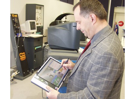 Vor kurzer Zeit noch Utopie. Frank Scherschmidt demonstriert die Bedienung der Achsmesssoftware via Stift. |