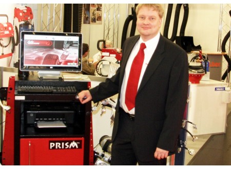 Sven Lachmund, Vertriebsmann bei der Snap-on Equipment, am JOHN BEAN Fahrwerkvermessungssystem Visualiner PRISM. |