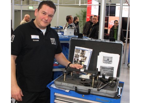 Auf der WM-Werkstattmesse 2012 - Fritz Heidelmann von SW-Stahl an der neuen Ausziehvorrichtung für Einspritzdüsen. |