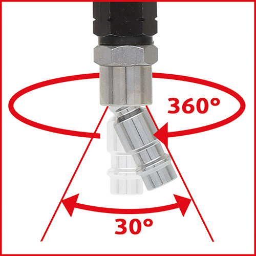 Die Reinigungspistole ist sehr leicht zu handhaben, vor allem, weil sie einen um 360 Grad drehbaren und zu 30 Grad abwinkelbaren Kugelgelenk-Stecknippel hat. Dadurch kann sich der Reinigungsprofi während der Arbeit voll auf die vor ihm liegenden Flächen und Winkel konzentrieren, ohne sich über das Drehen oder Neigen des Gerätes Gedanken zu machen. Den Druck kann er mit dem integrierten Druckregulierer ganz nach Wunsch einstellen.